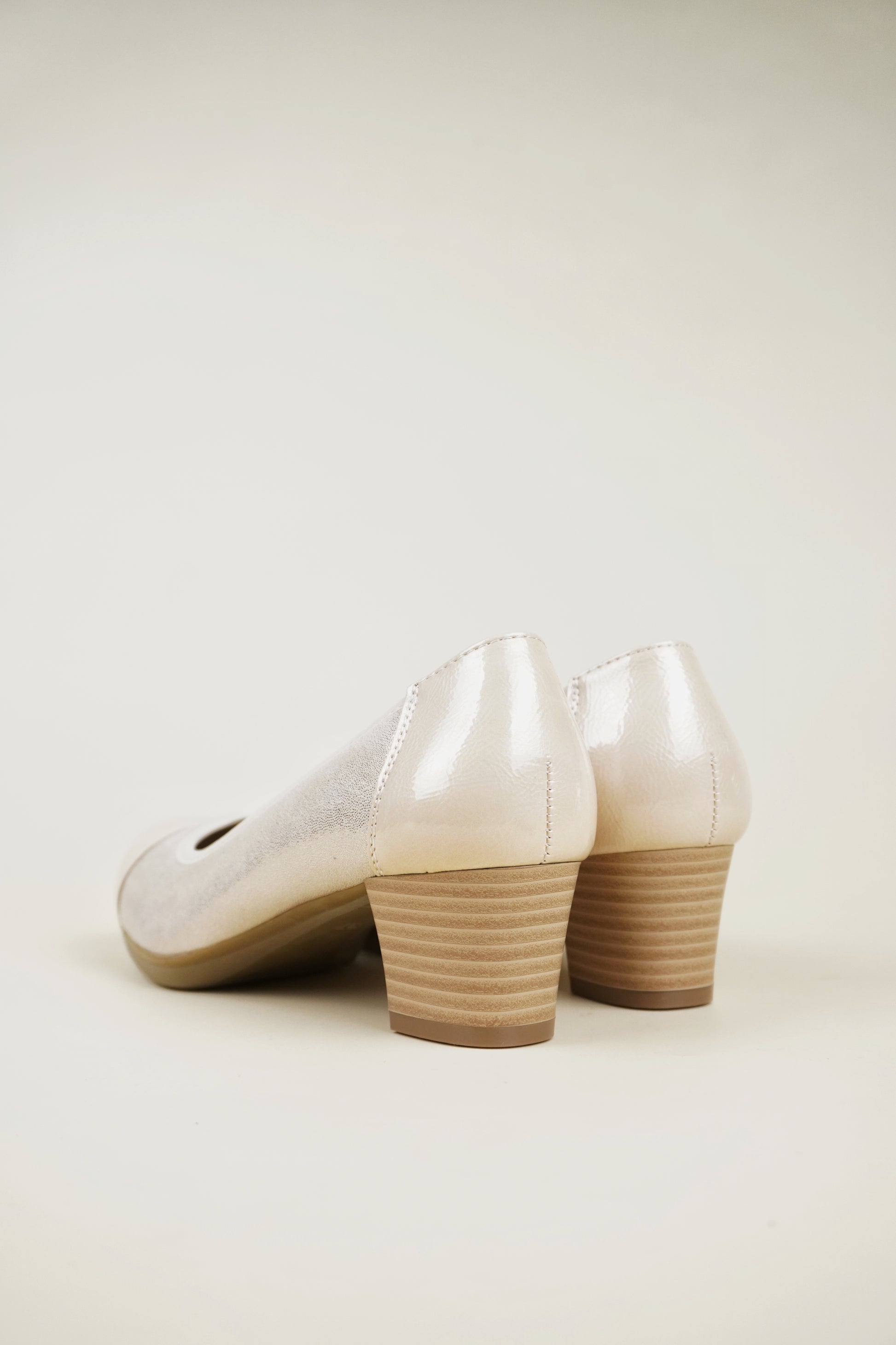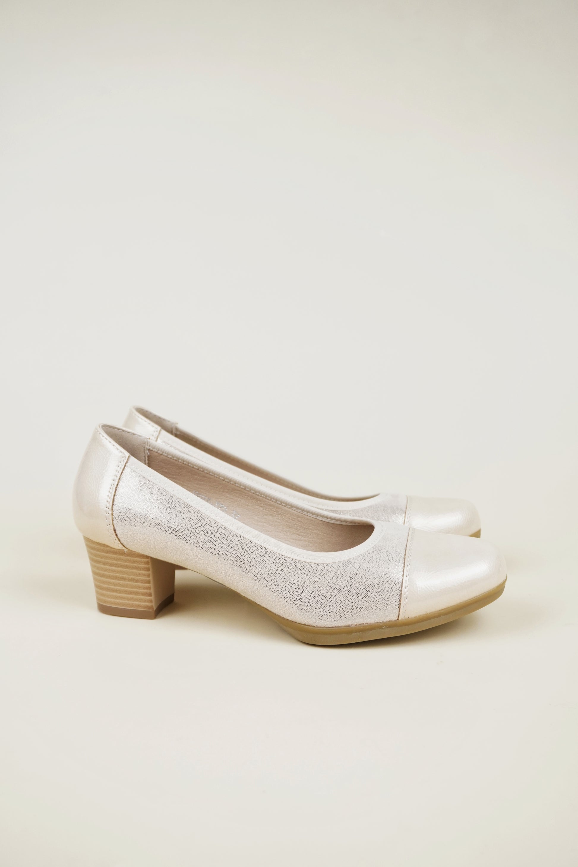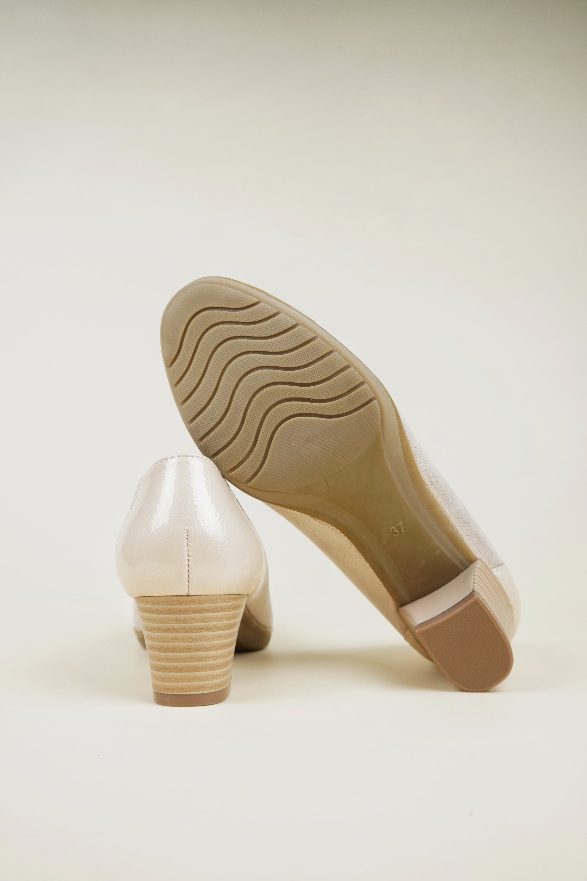Elegant faux leather court shoes with textured body, matching toe and heel in patent faux leather. The low block heels and the soft insole makes them comfortable to wear all day long.