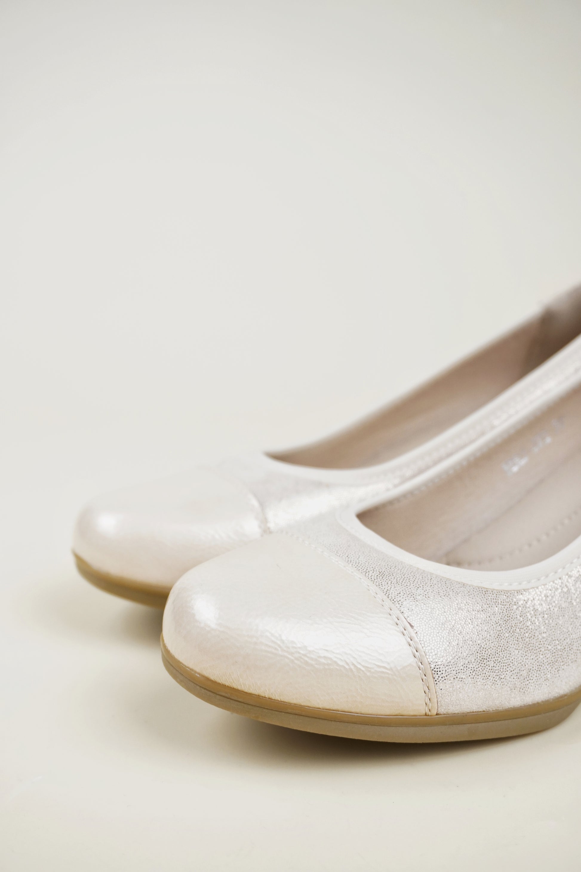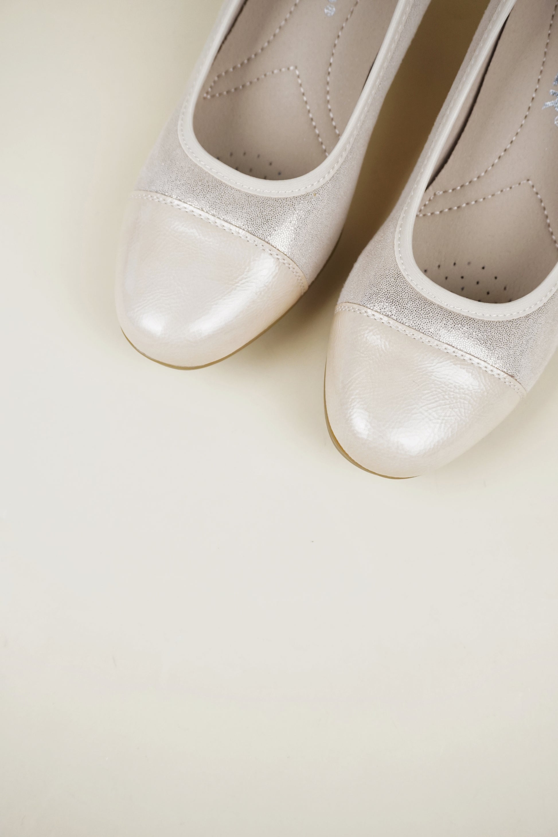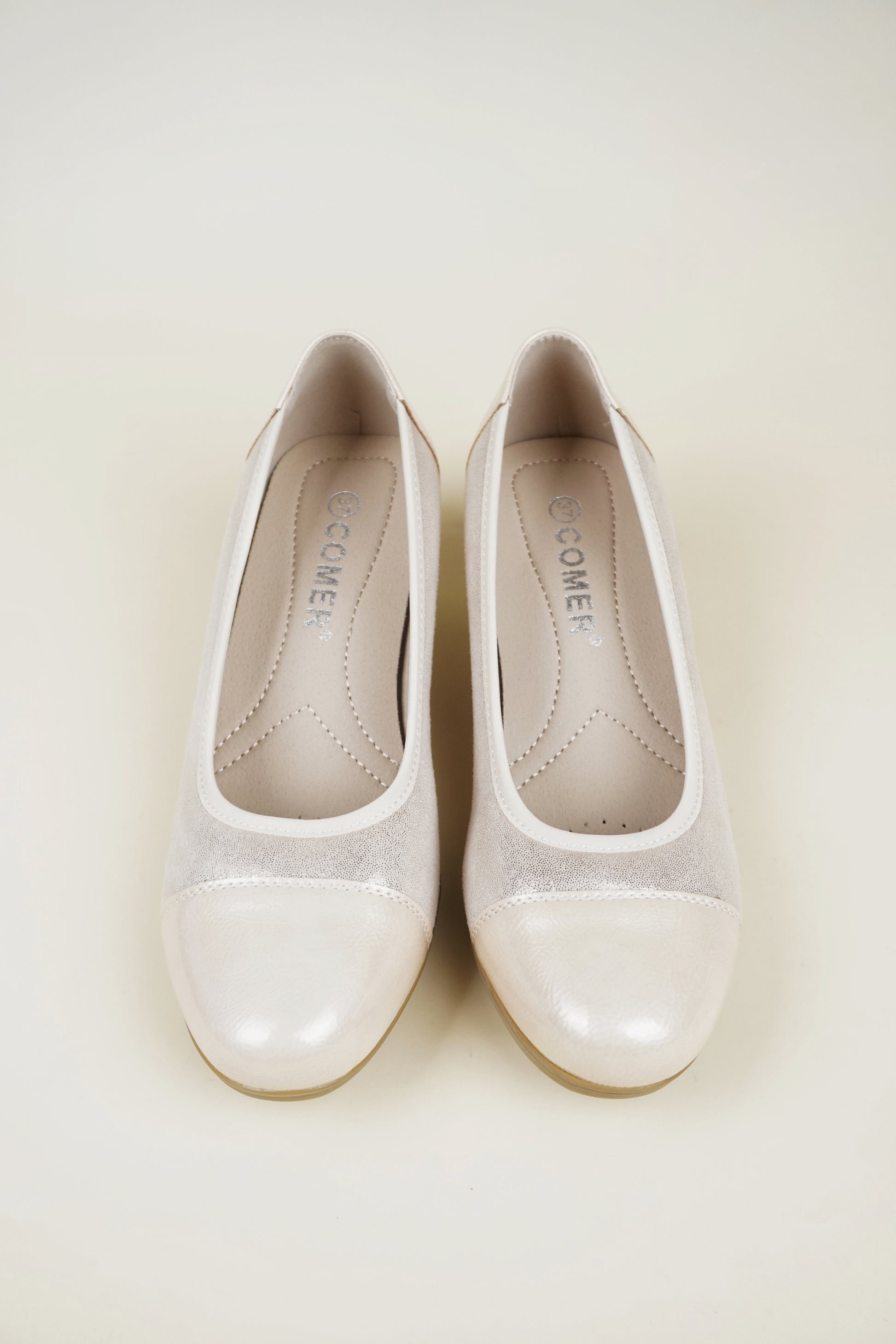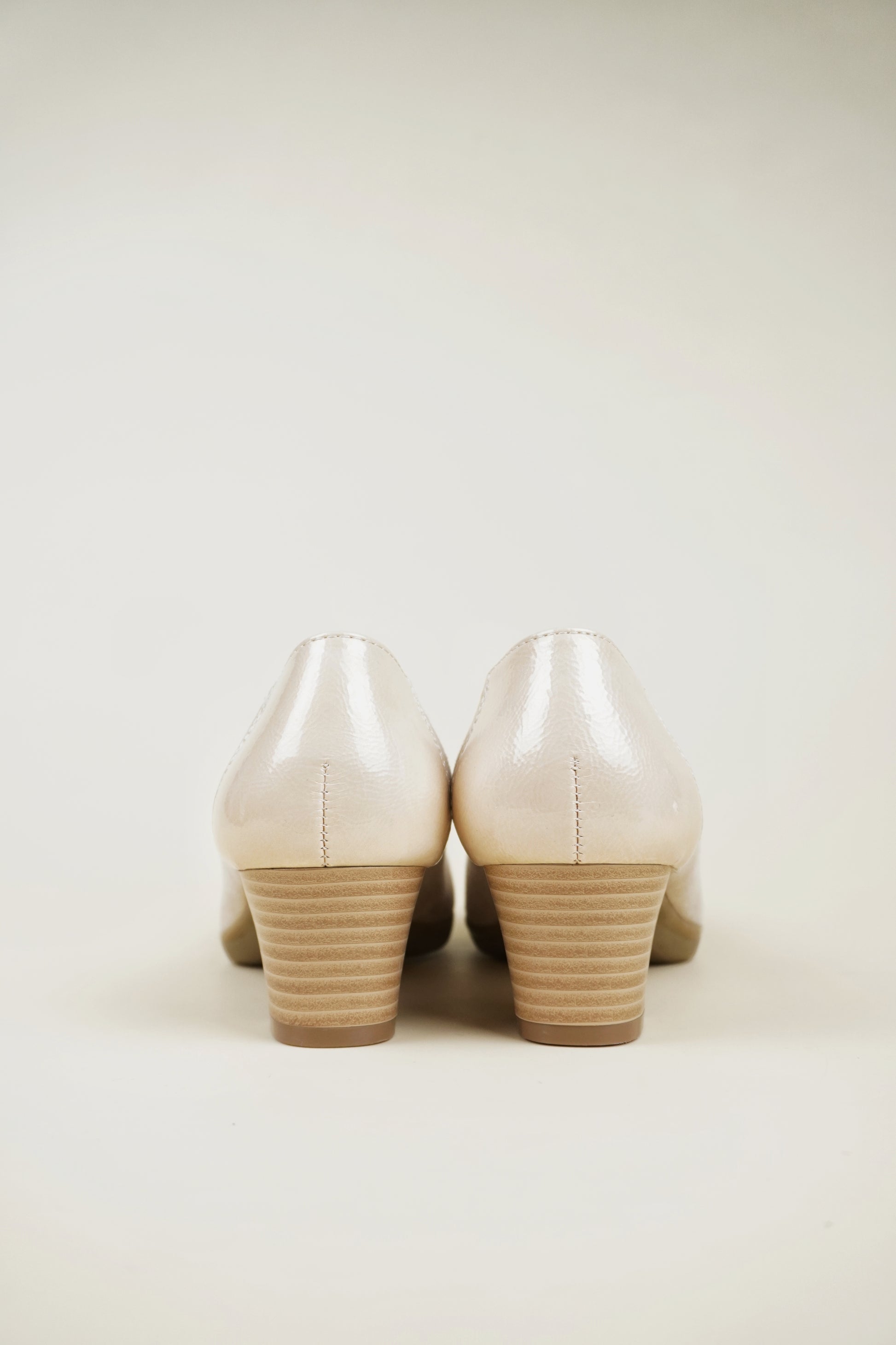 Elegant faux leather court shoes with textured body, matching toe and heel in patent faux leather. The low block heels and the soft insole makes them comfortable to wear all day long.