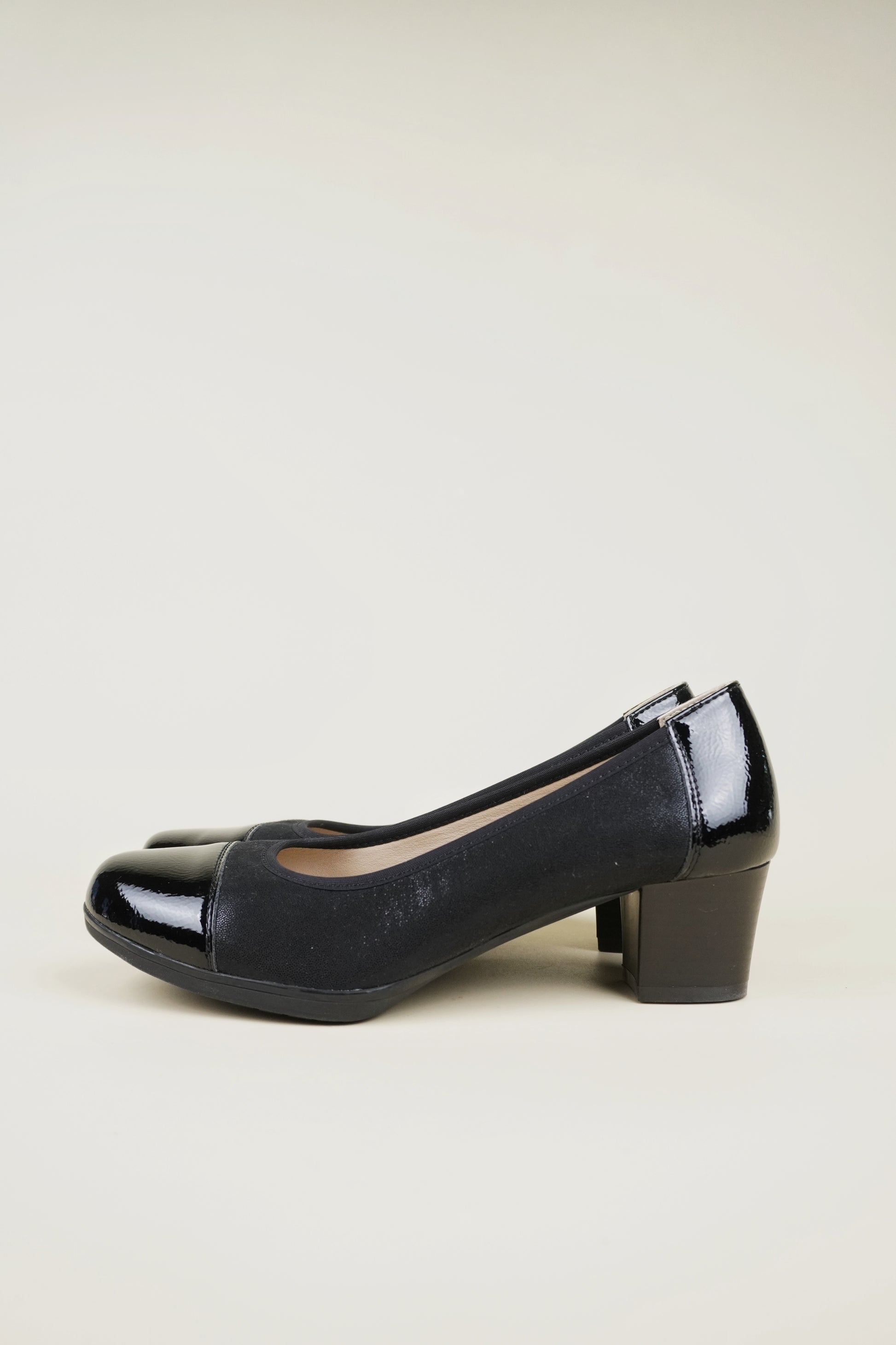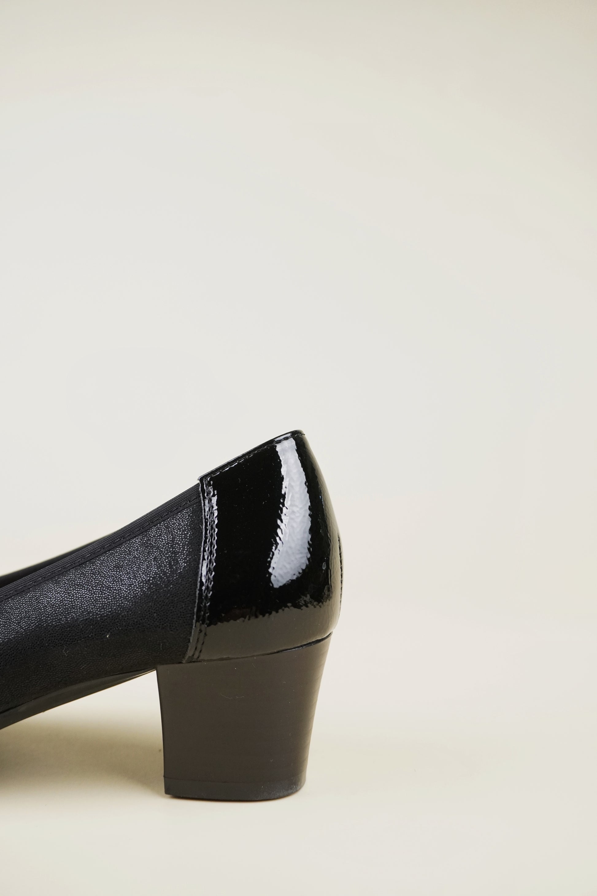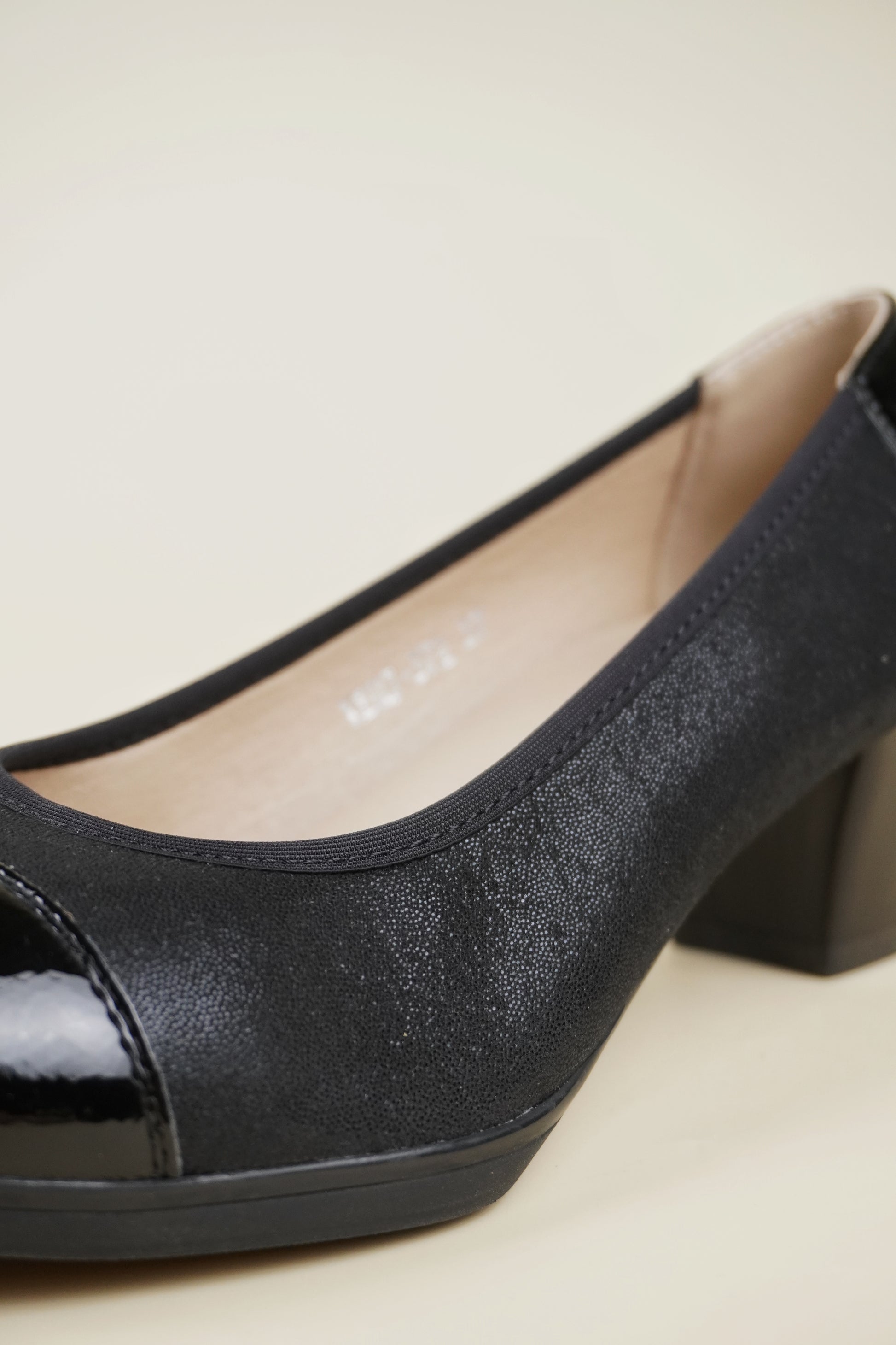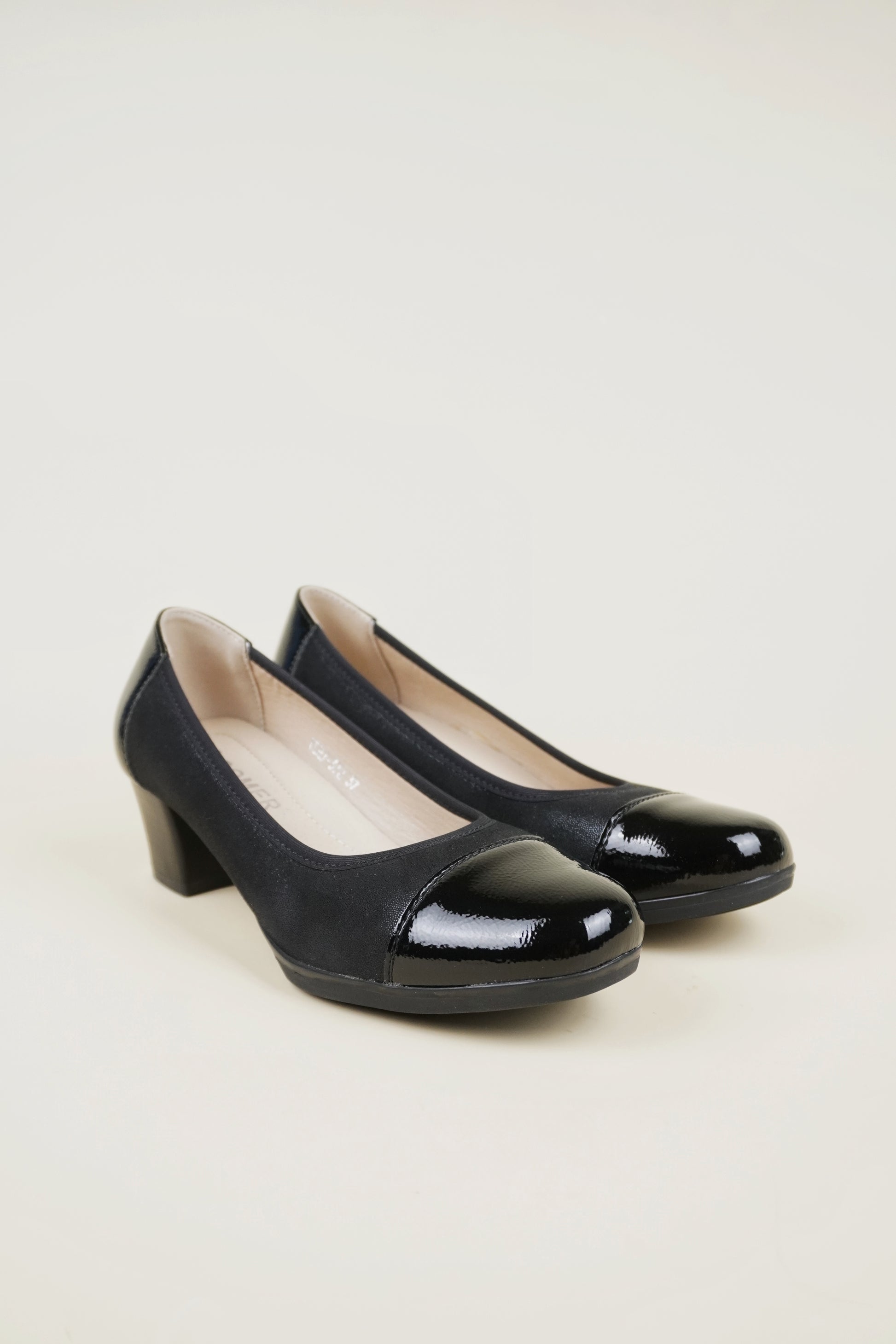 Elegant faux leather court shoes with textured body, matching toe and heel in patent faux leather. The low block heels and the soft insole makes them comfortable to wear all day long.