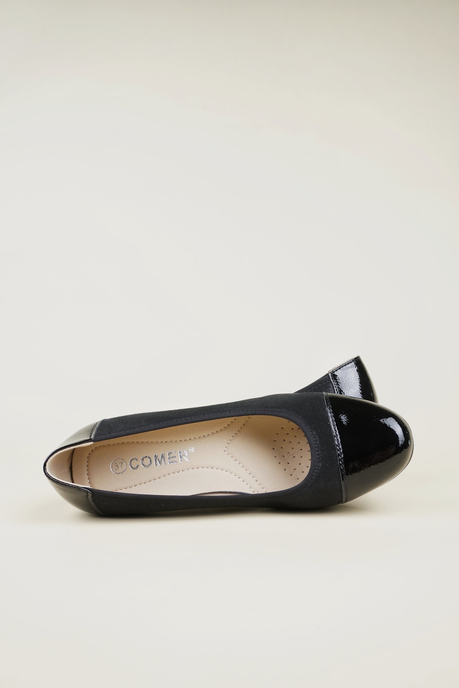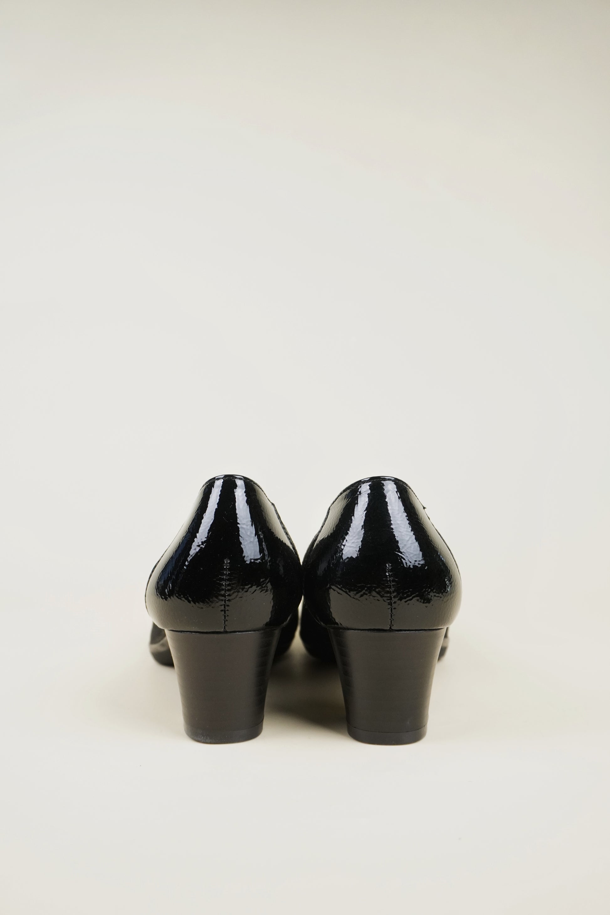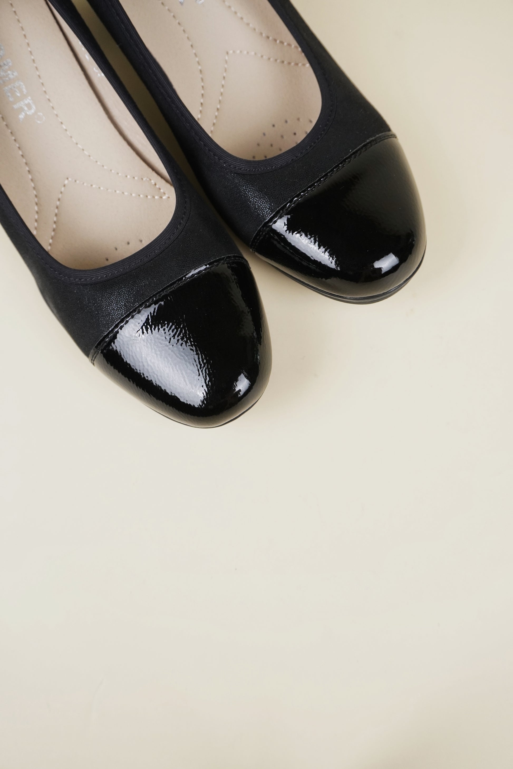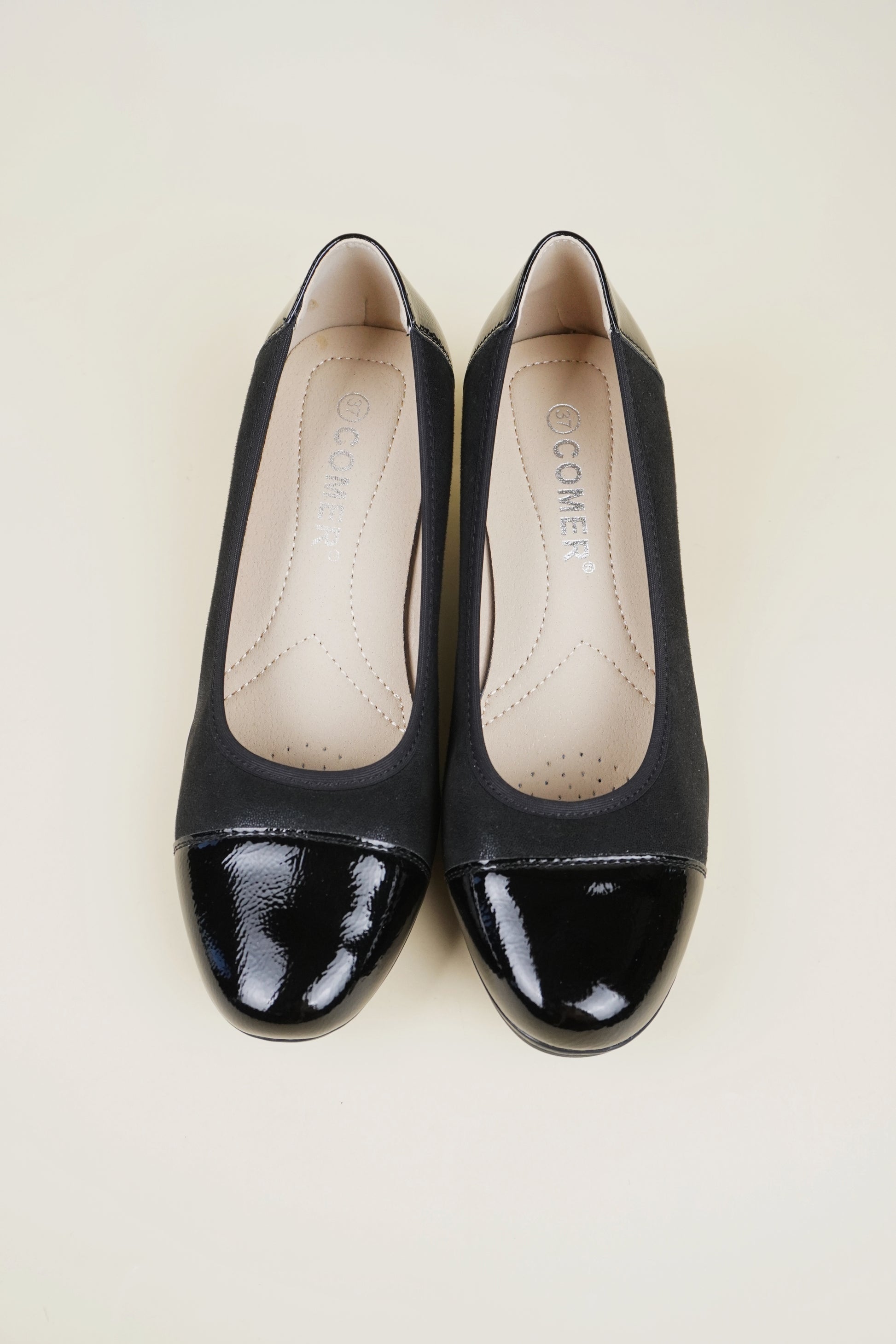Elegant faux leather court shoes with textured body, matching toe and heel in patent faux leather. The low block heels and the soft insole makes them comfortable to wear all day long.