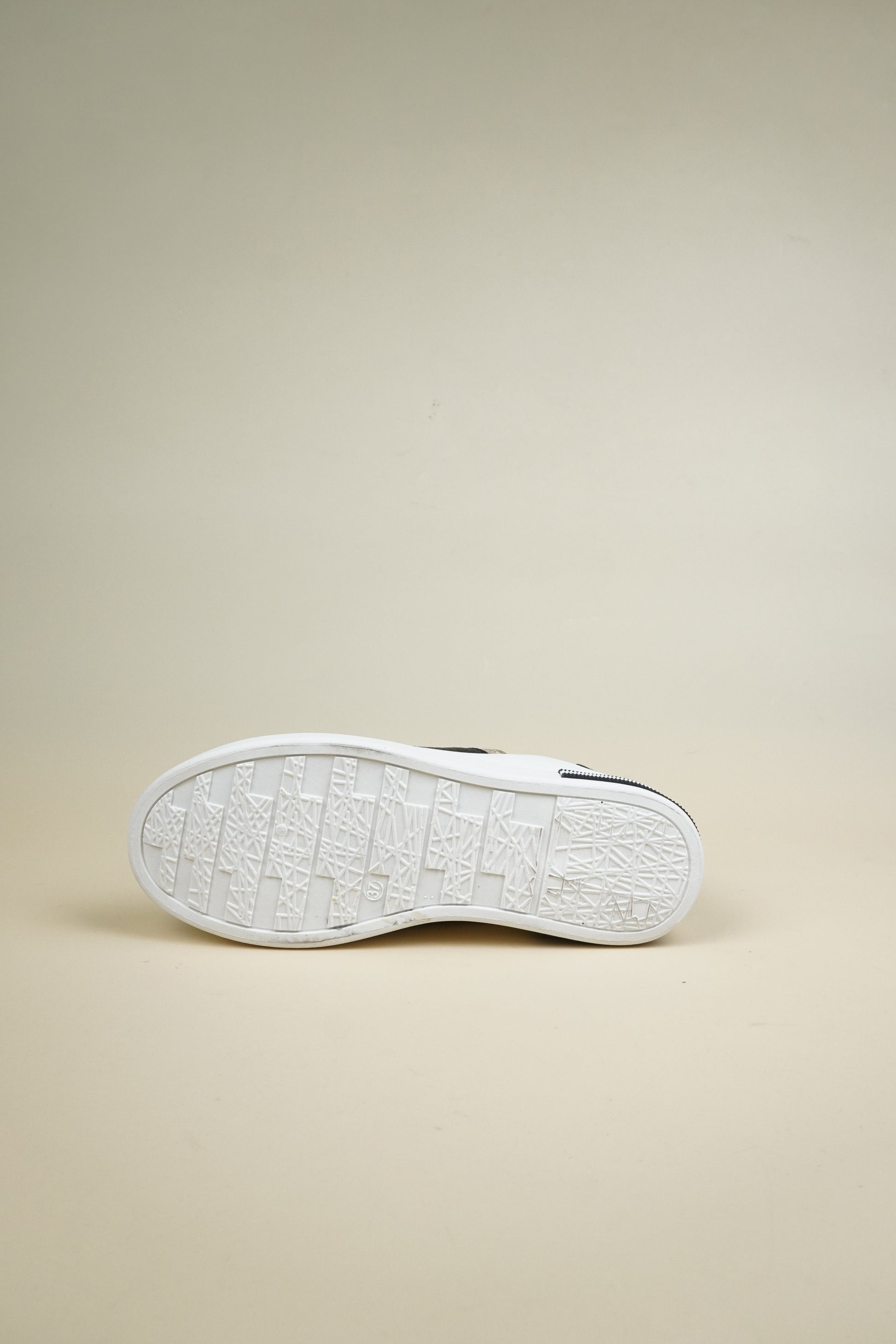 Women's black sneakers with gold accent and deisgned heels, ideal for everyday wear.