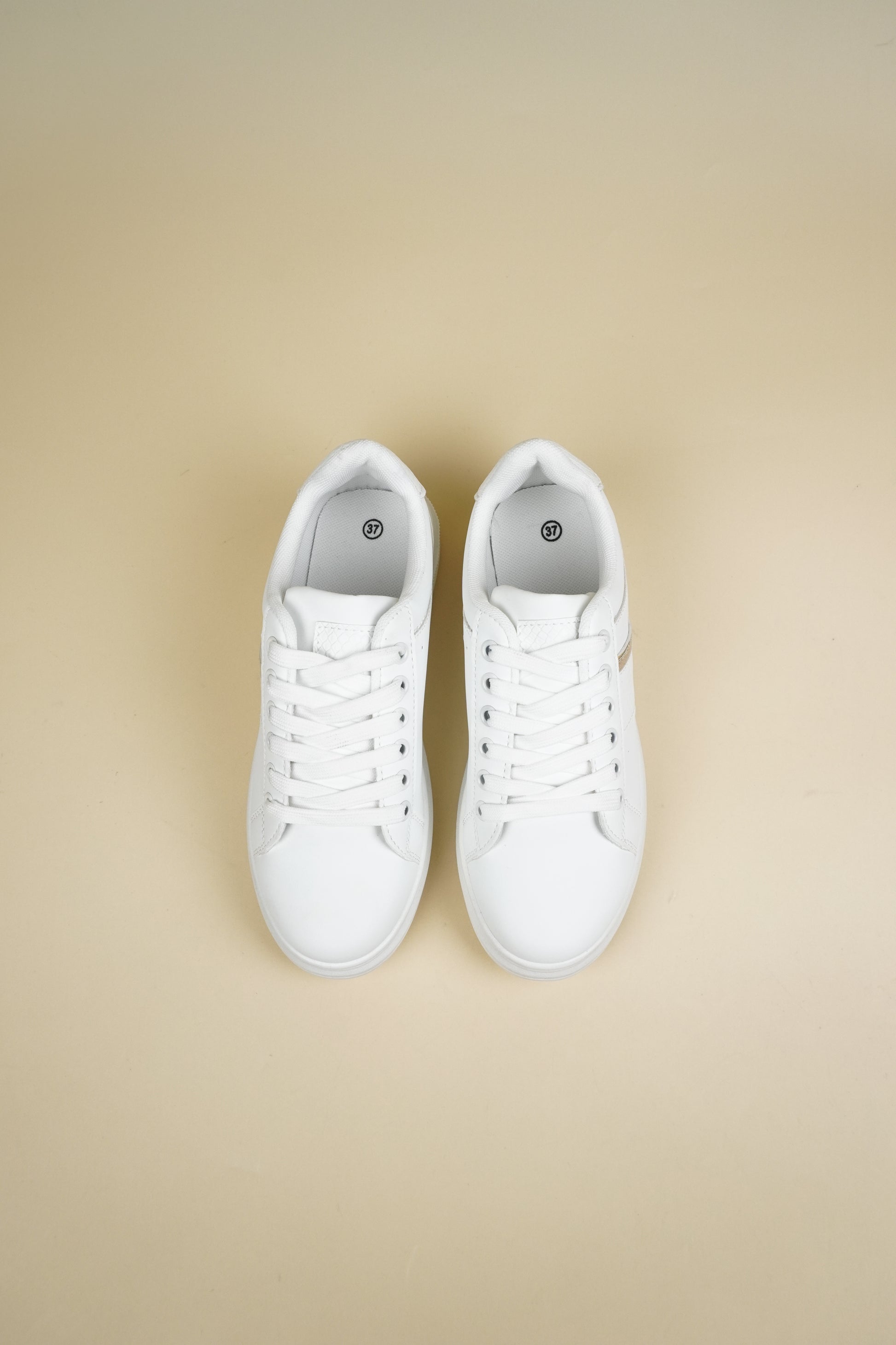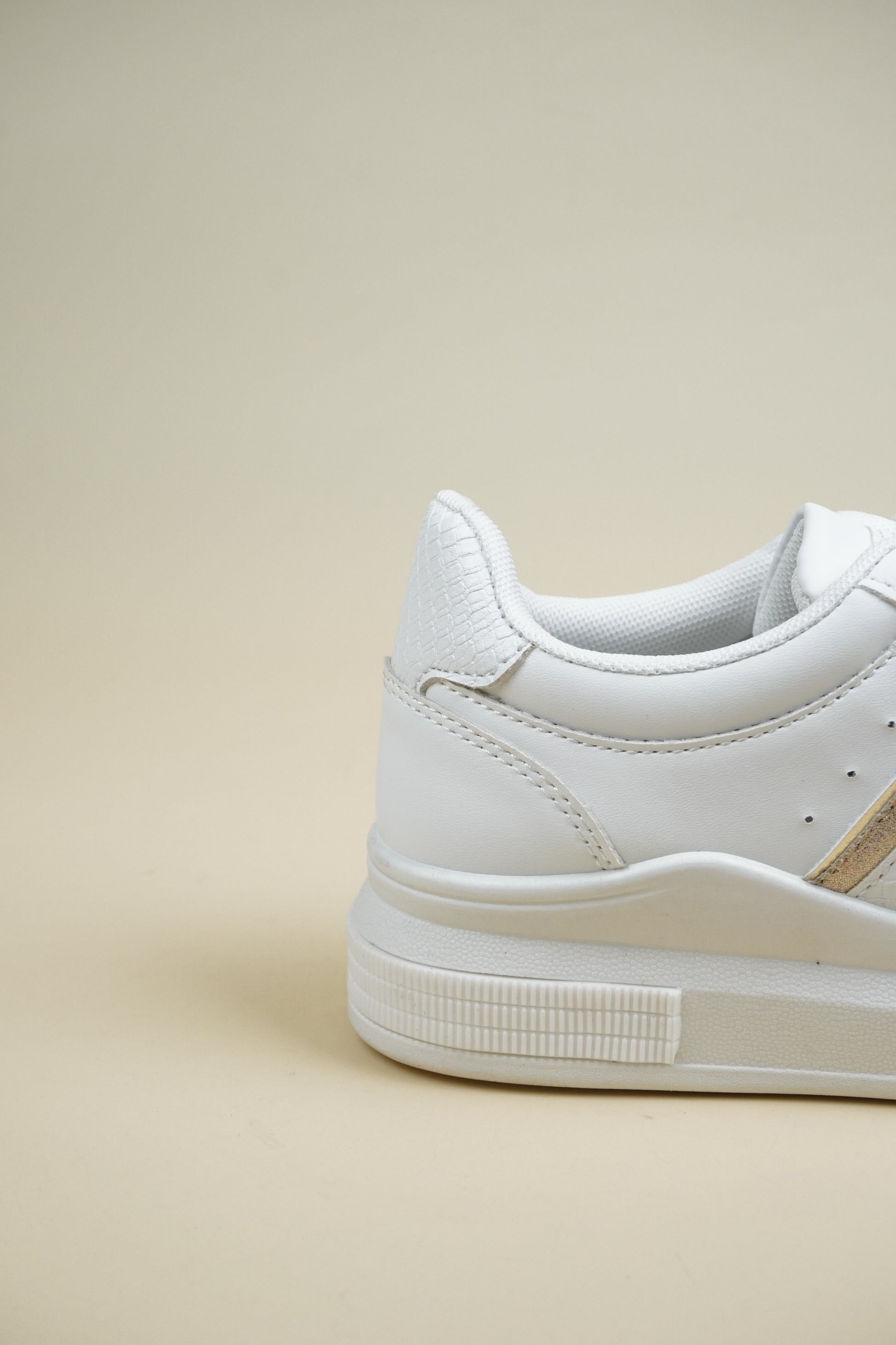 Women's white sneakers with gold accent and deisgned heels, ideal for everyday wear.