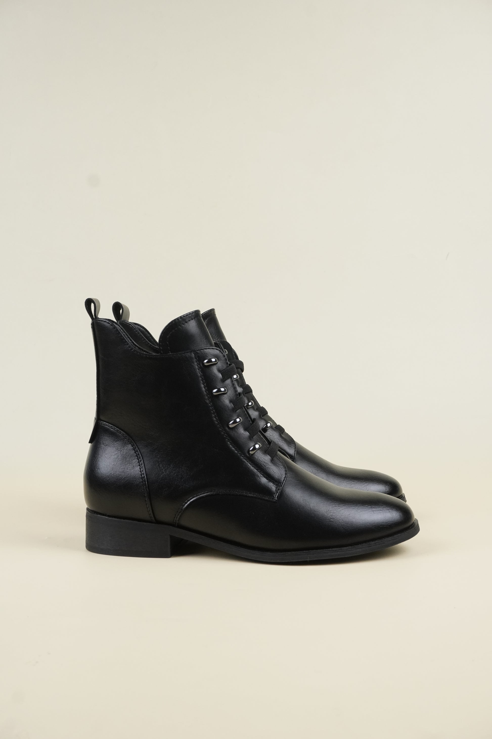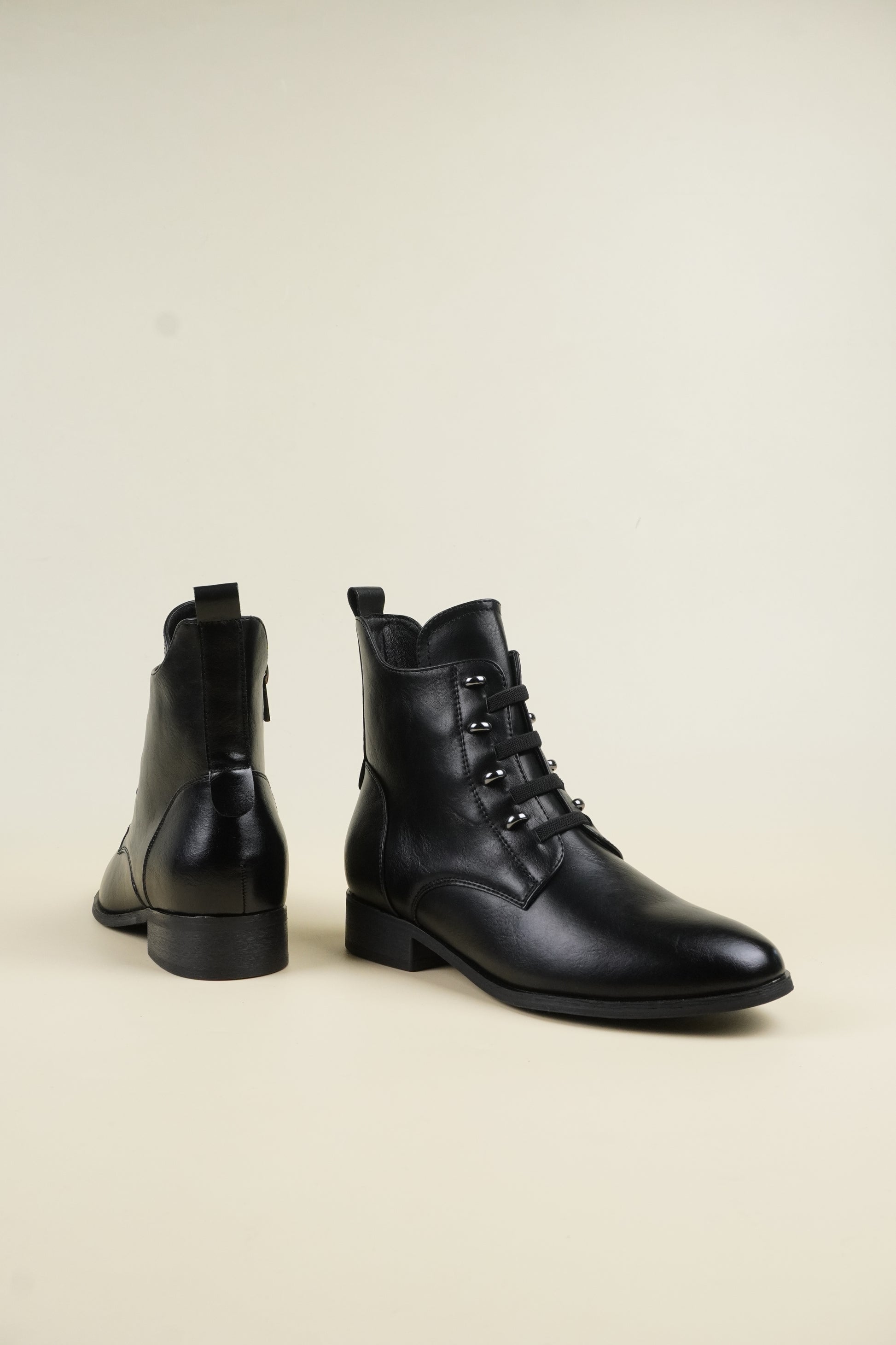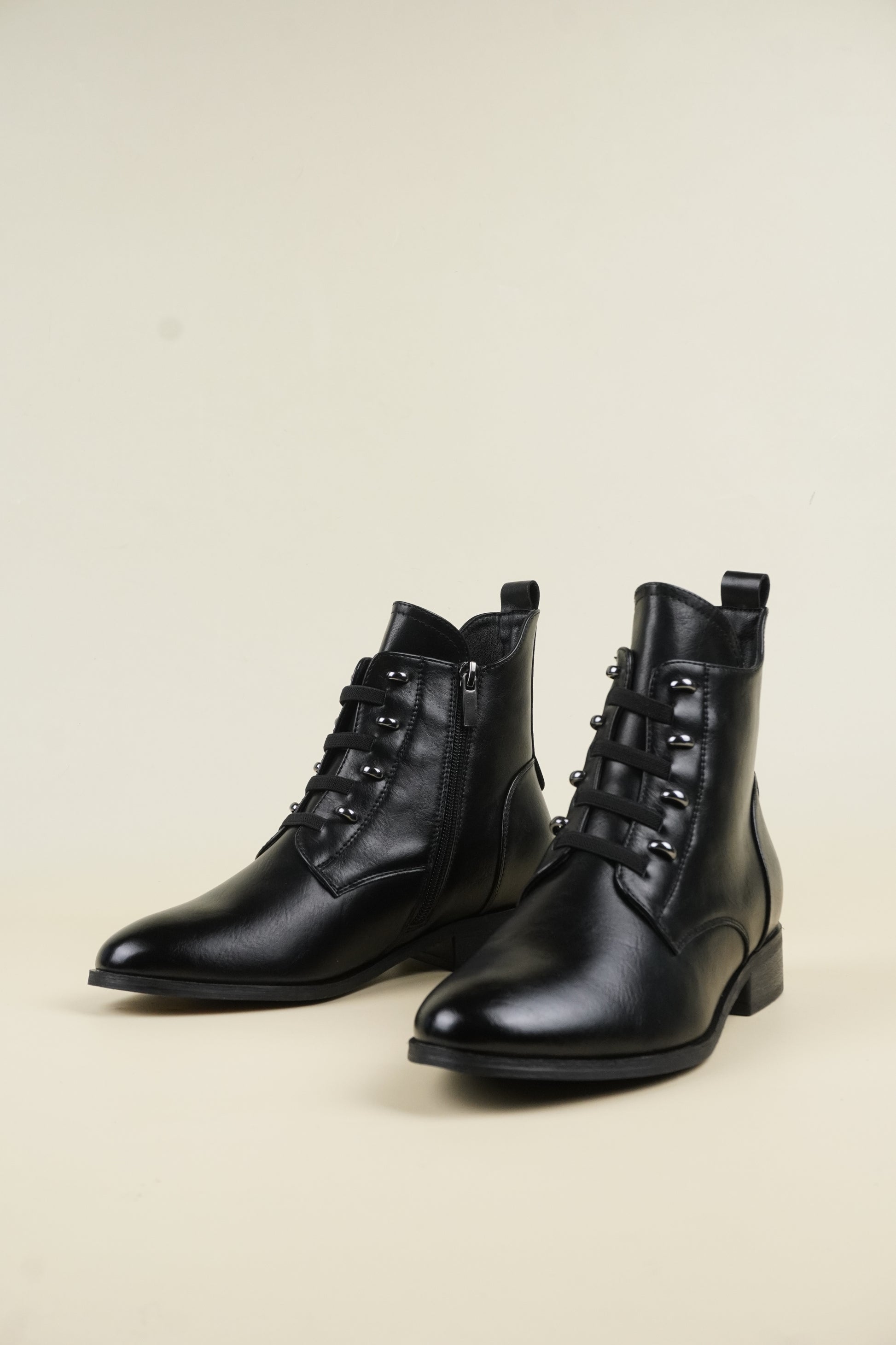 Ankle boots with 3 cm* flat heels, compliments all outfit yet comfortable for all-day wear.