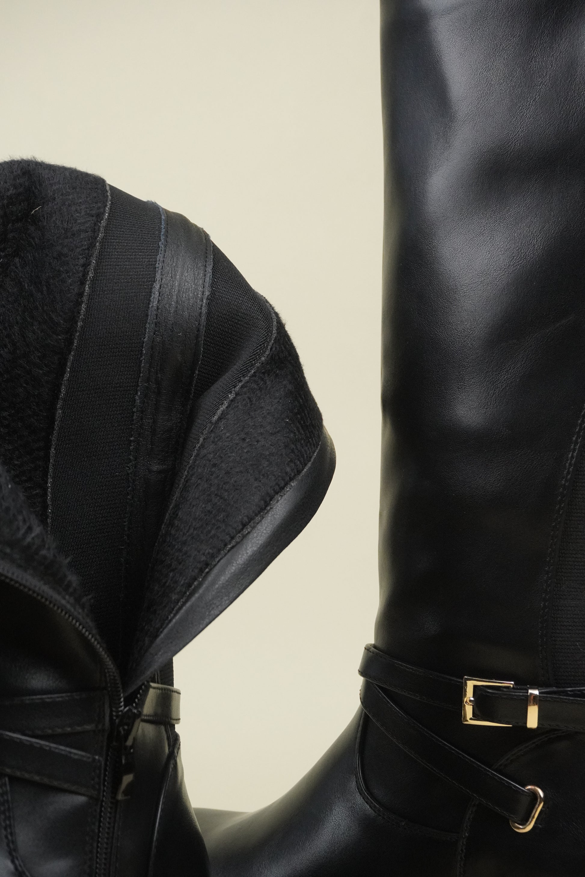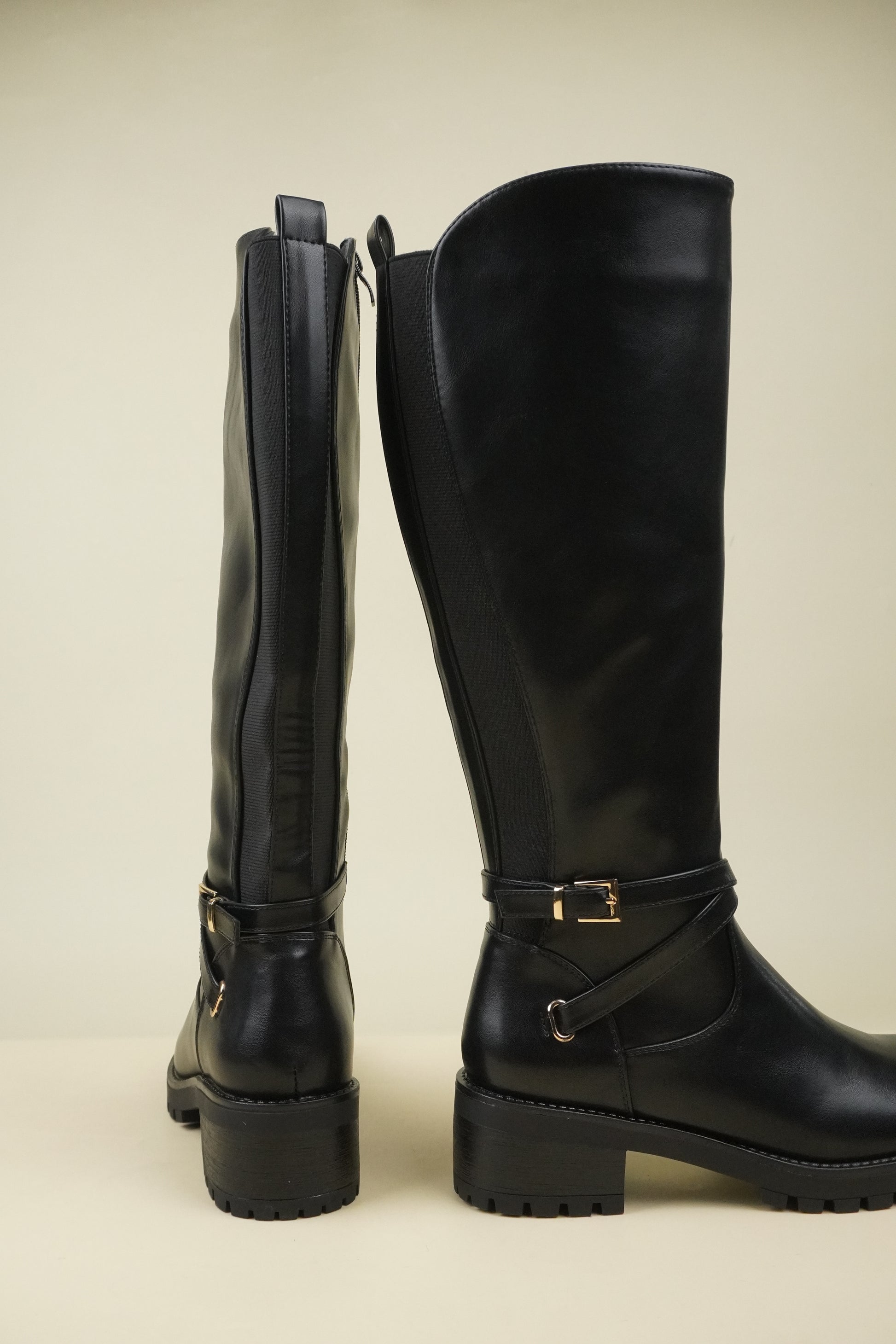 Women's knee high boots with decorative ankle buckle strap, matches all your winter outfits and ideal for everyday wear. The elastic band on the side is strechable and allows a wider fit.