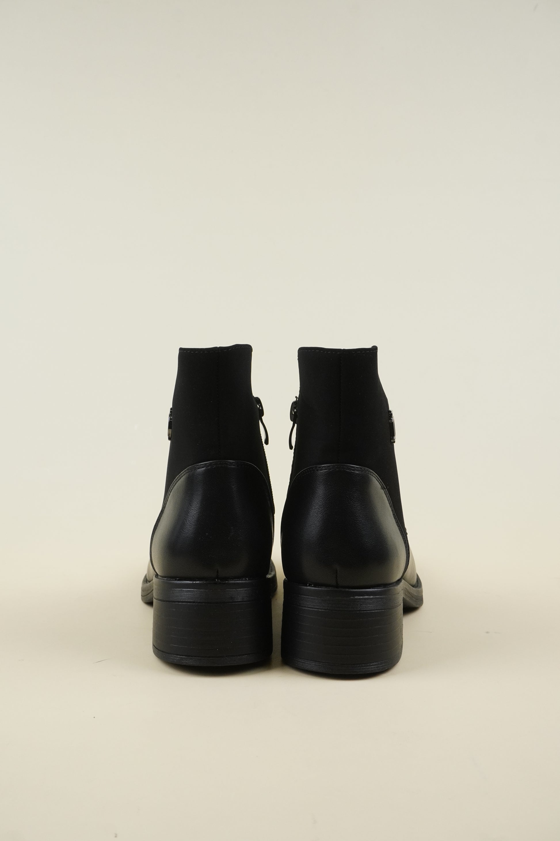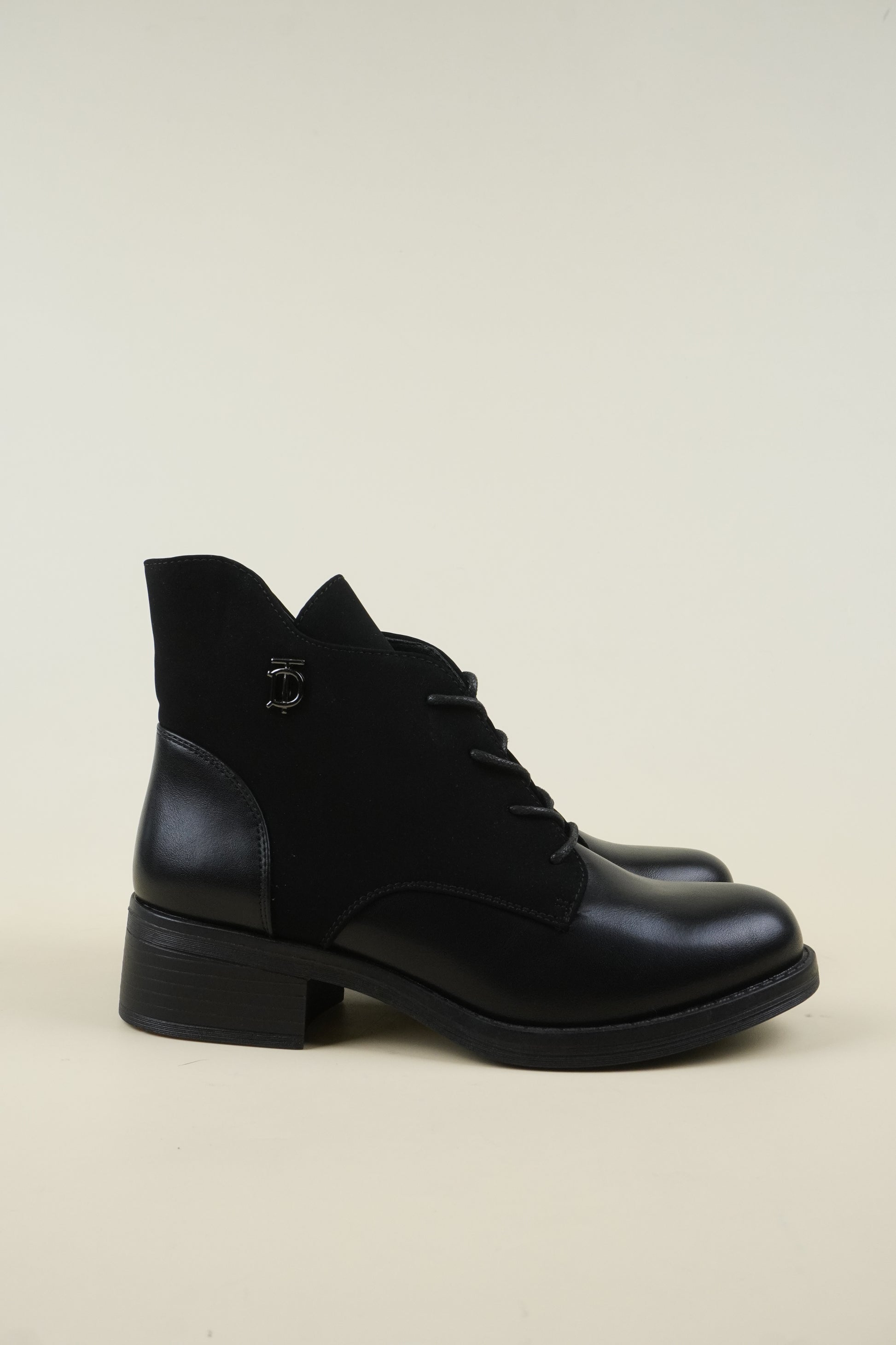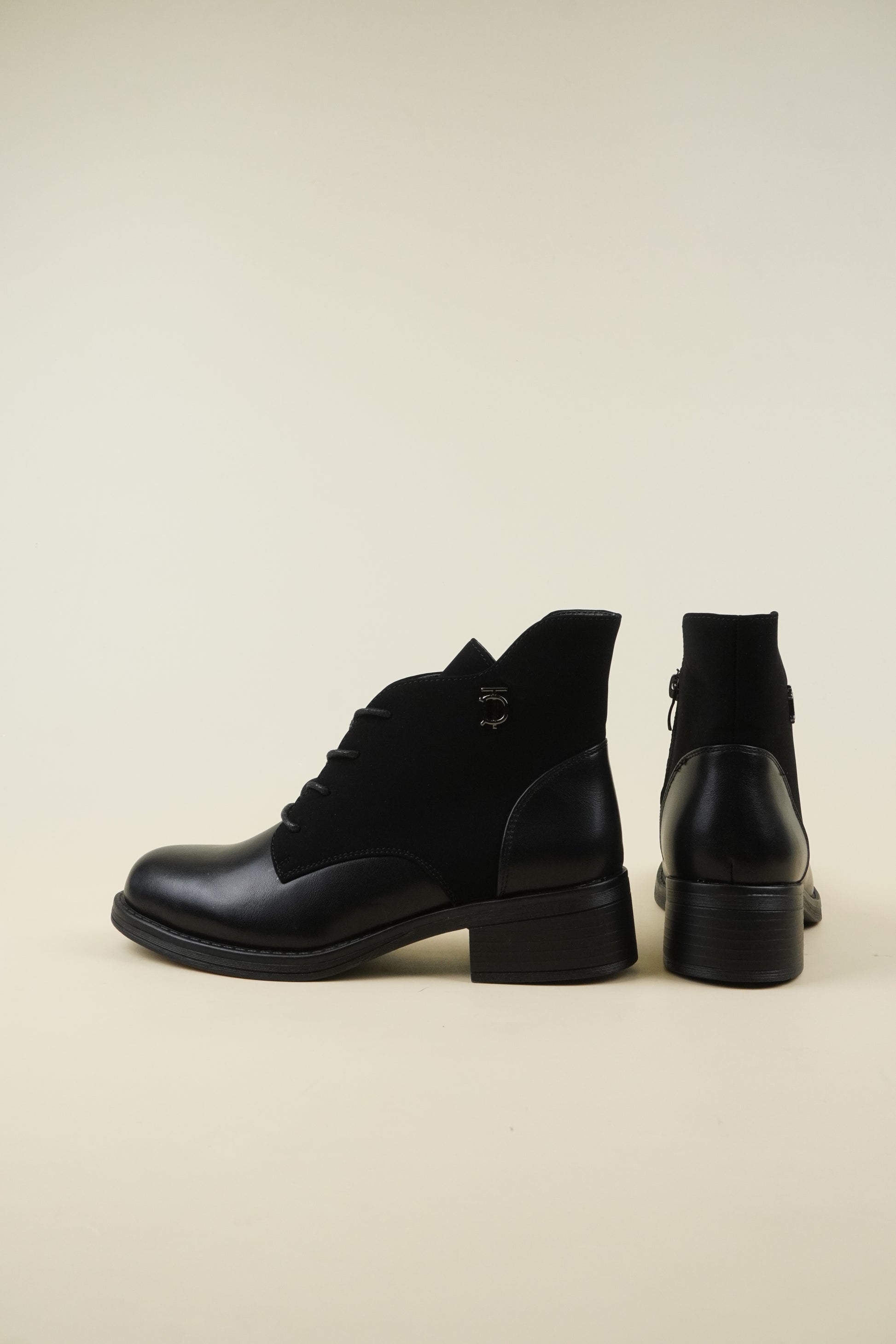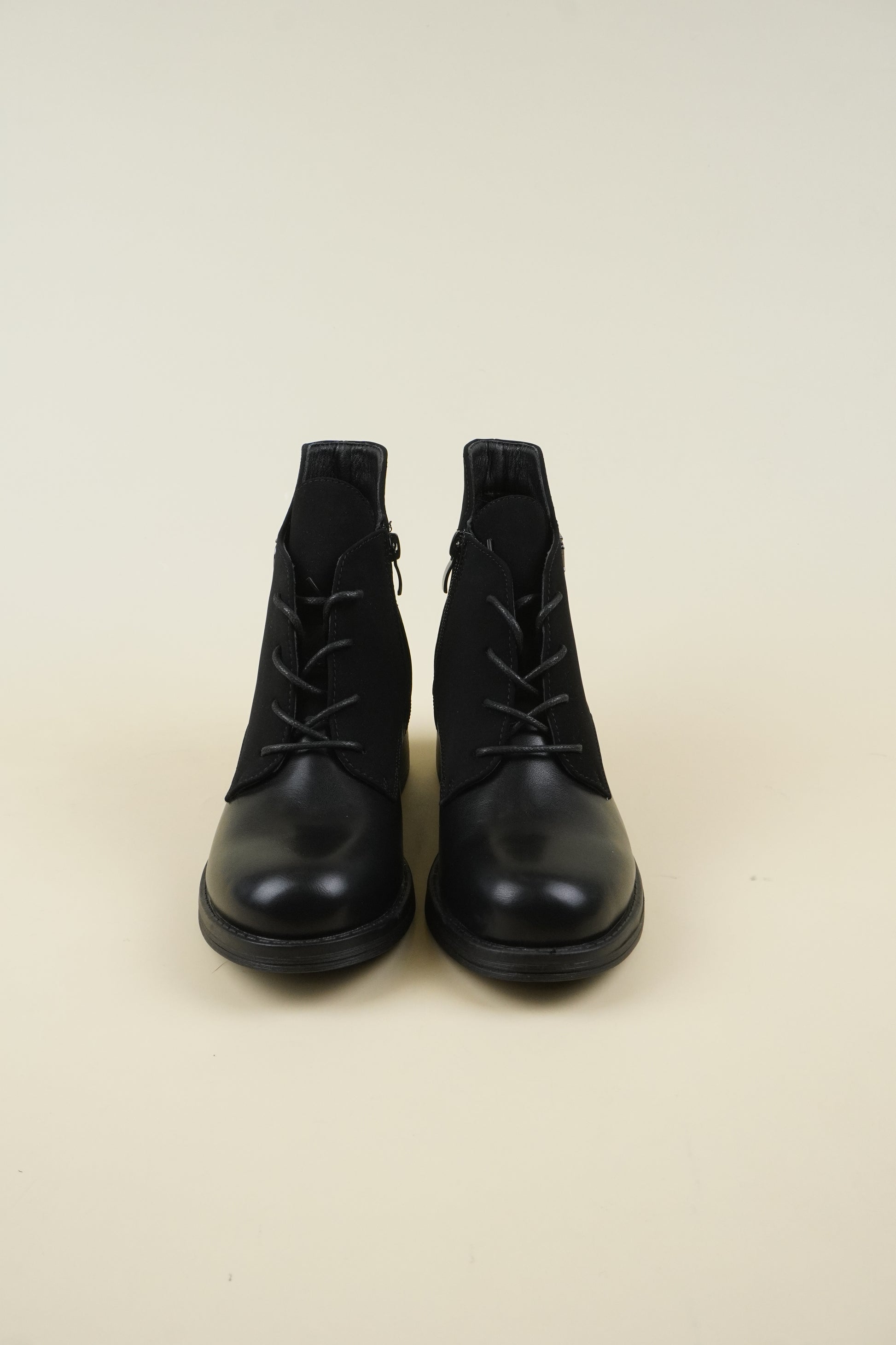 Flat ankle boots mixed with eco-leather and eco-suede, the 4 cm* block heel makes it comfortable for all-day wear.