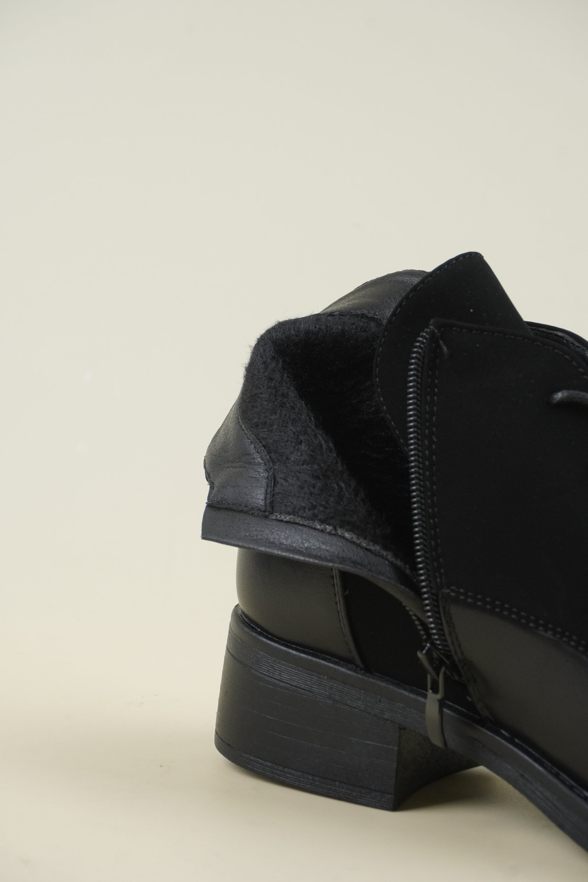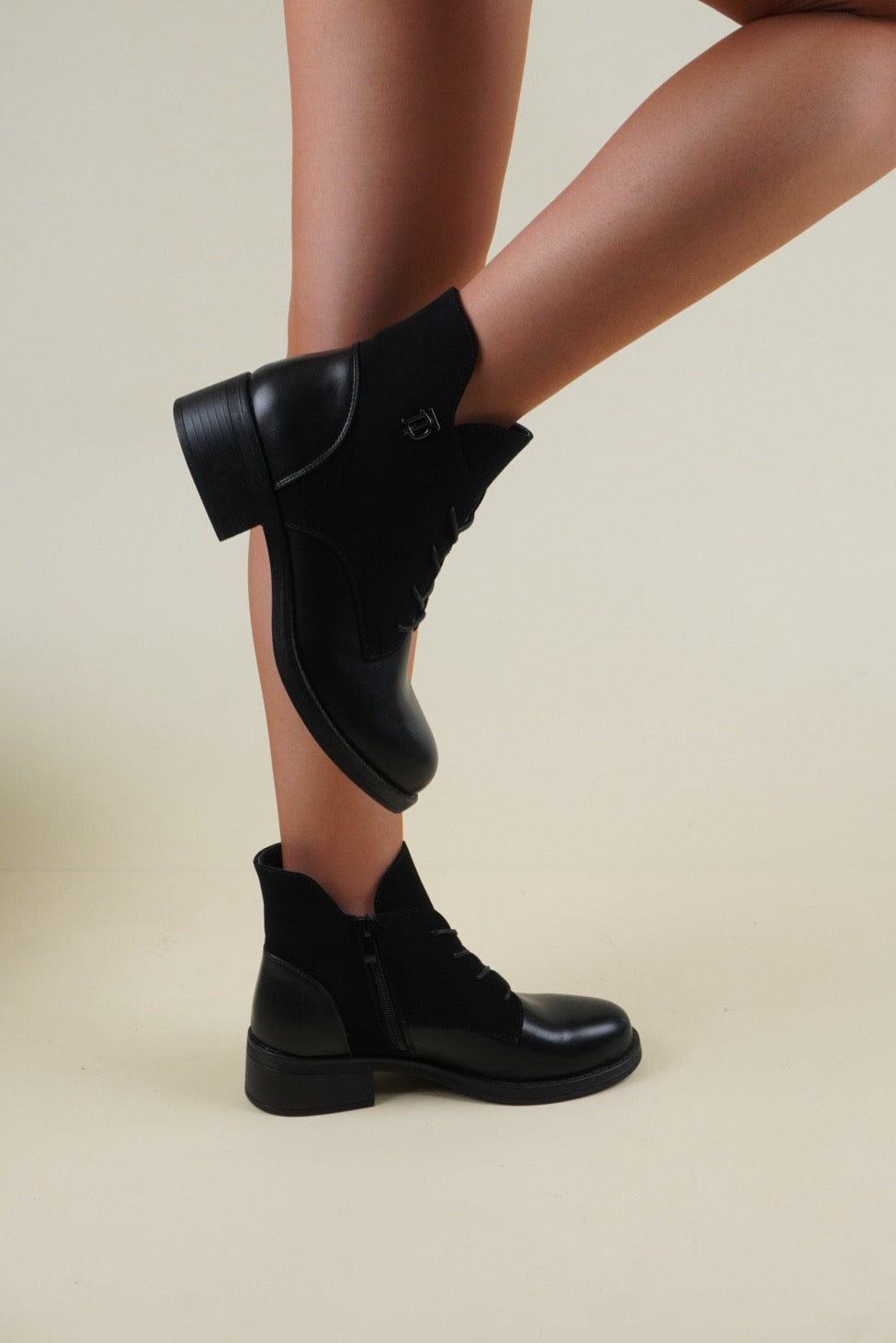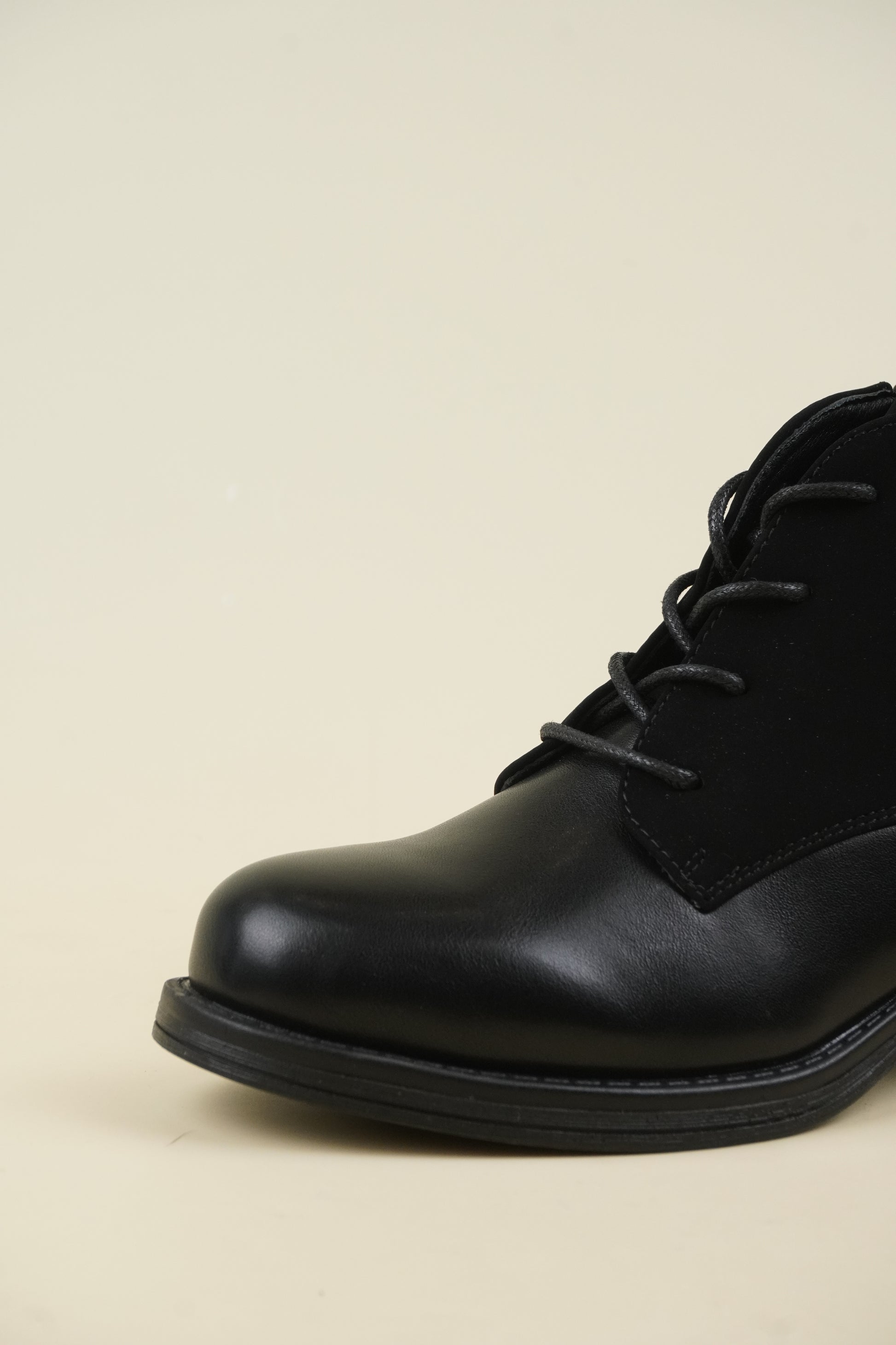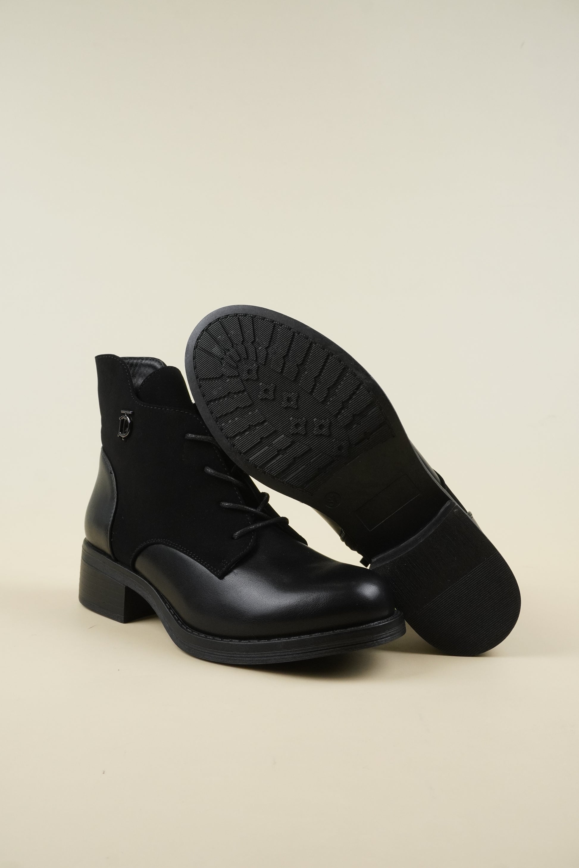 Flat ankle boots mixed with eco-leather and eco-suede, the 4 cm* block heel makes it comfortable for all-day wear.